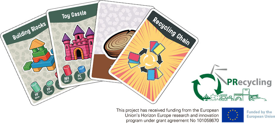 Una de las herramientas educativas creadas en el marco del proyecto es el juego de mesa “Precycling Toys”, desarrollado junto a la empresa Juguetes Cayro S.L. En él, los jugadores se convierten en expertos recicladores que deben reunir las cartas de piezas necesarias para construir diferentes juguetes, atendiendo al tipo de material (como plástico, metal o madera) y al tamaño que requiere cada modelo. Cada juguete completado otorga puntos, fomentando la estrategia, la cooperación y la comprensión del valor del reciclaje. A través de la diversión, el juego transmite de forma práctica los principios de la economía circular, mostrando que cada juguete puede tener una segunda vida y que reciclar también es volver a jugar.